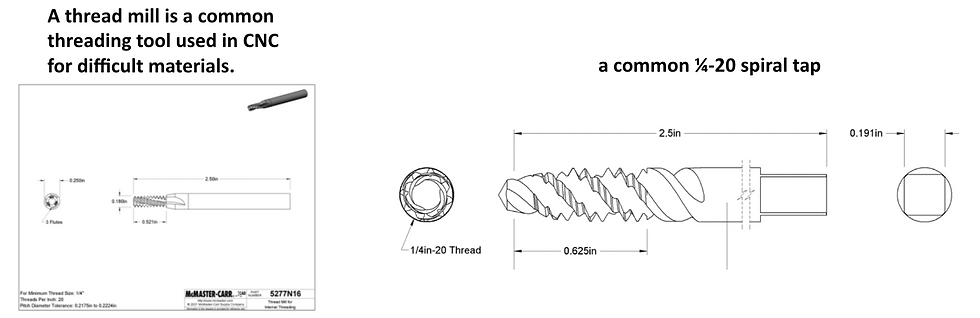 For example, a ¼-20 hole would be drilled to 0.625” depth and tapped to 0.5” depth. An M6x1 hole would be drilled to 15mm and tapped to 12mm. When additional tapping depth is truly needed, say for a set screw or sensor, consider adding a counterbore above the threaded portion.